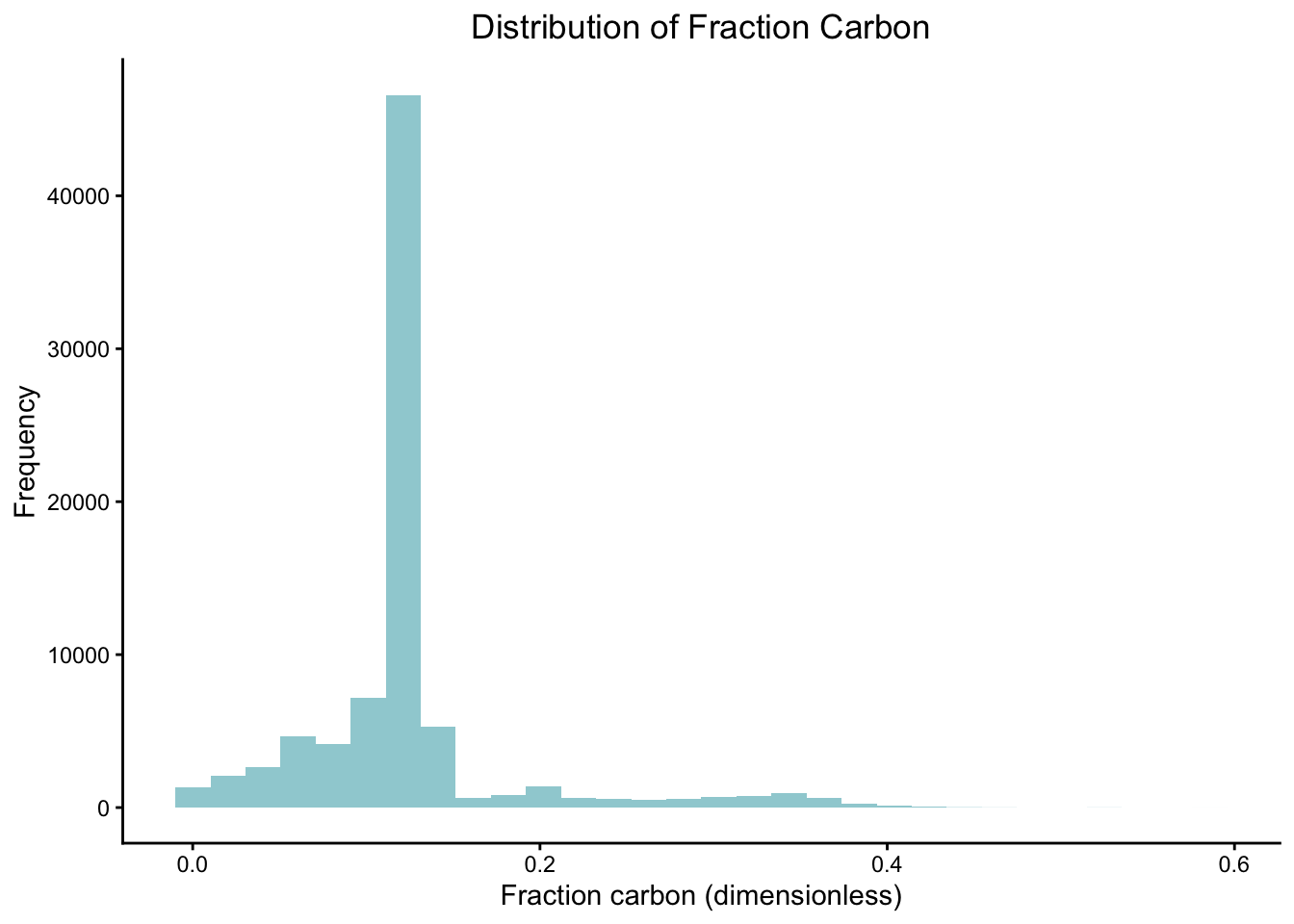 frac_car_plot <- blue_carbon %>%ggplot(aes(fraction_carbon)) +geom_histogram(fill ="#9fd0d6") +labs(x ="Fraction carbon (dimensionless)", y ="Frequency", title ="Distribution of Fraction Carbon") +theme_classic() +theme(plot.title =element_text(hjust =0.5)) # Center title frac_car_plot
