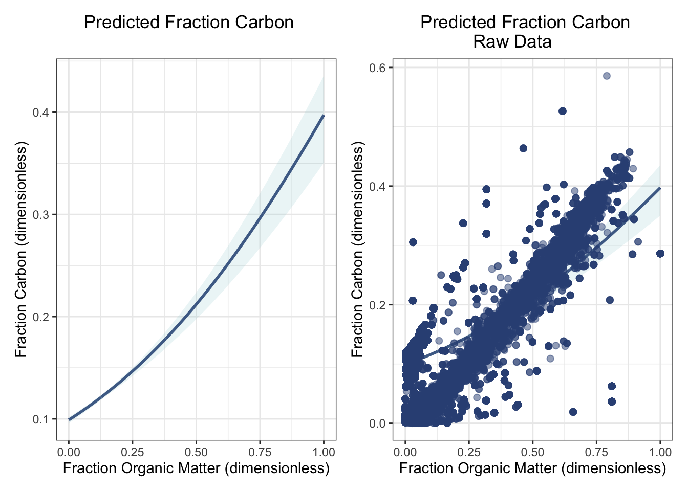 # .....Plot predictions.....predict_plot <-ggplot() +# Predicted linegeom_line(data = betareg_grid, aes(x = fraction_organic_matter, y = predictions), color ="#345084FF", size =1) +# Confidence Interval geom_ribbon(data = boot_ci, aes(x = fraction_organic_matter, ymin = ci_lwr, ymax = ci_upr), fill ="#9FD0D6", alpha =0.2) +labs(x ="Fraction Organic Matter (dimensionless)", y ="Fraction Carbon (dimensionless)", title ="Predicted Fraction Carbon") +theme_bw() +theme(plot.title =element_text(hjust =0.4)) # Center title predict_plot_data <-ggplot() +# Predicted linegeom_line(data = betareg_grid, aes(x = fraction_organic_matter, y = predictions), color ="#345084FF", size =1) +# Confidence Interval geom_ribbon(data = boot_ci, aes(x = fraction_organic_matter, ymin = ci_lwr, ymax = ci_upr), fill ="#9FD0D6", alpha =0.2) +# Original data pointsgeom_point(data = blue_carbon, aes(x = fraction_organic_matter, y = fraction_carbon),alpha =0.5, size =2, color ="#345084FF") +labs(x ="Fraction Organic Matter (dimensionless)", y ="Fraction Carbon (dimensionless)", title ="Predicted Fraction Carbon\nRaw Data") +theme_bw() +theme(plot.title =element_text(hjust =0.4)) # Center title # Plot side-by-sidepredict_plot + predict_plot_data