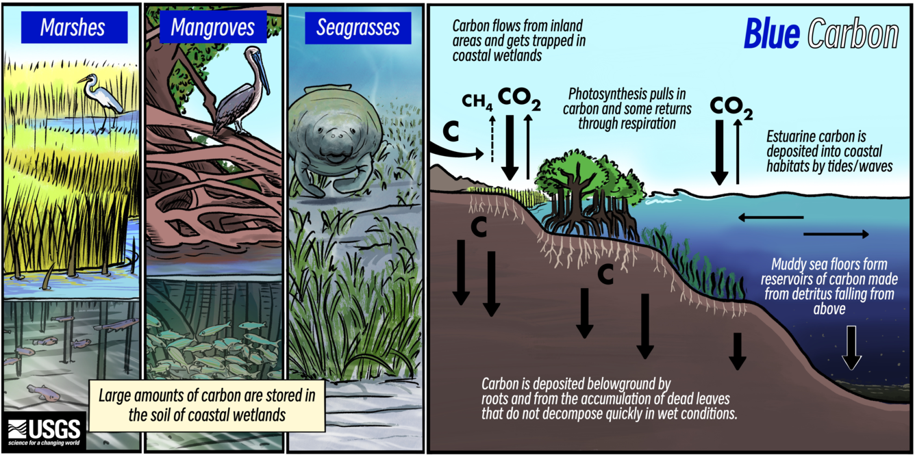 Graphic of blue carbon ecosystems and carbon sequestration. Source: USGS